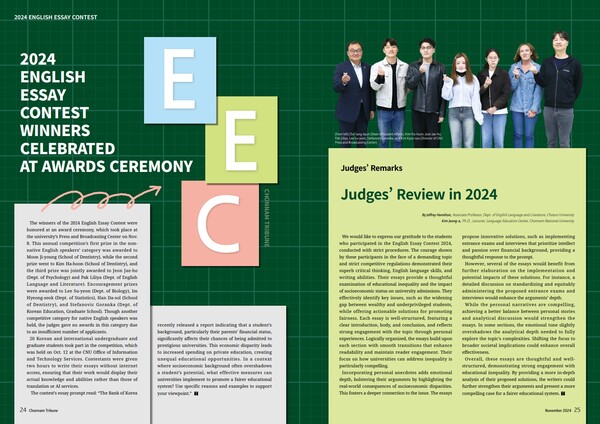 The winners of the 2024 English Essay Contest were honored at an award ceremony, which took place at the university’s Press and Broadcasting Center on Nov. 8. This annual competition’s first prize in the nonnative English speakers’ category was awarded to Moon Ji-young (School of Dentistry), while the second prize went to Kim Ha-hoon (School of Dentistry), and the third prize was jointly awarded to Jeon Jae-ho (Dept. of Psychology) and Pak Liliya (Dept. of English Language and Literature). Encouragement prizes were awarded to Lee Su-yeon (Dept. of Biology), Im Hyeong-seok (Dept. of Statistics), Han Da-sol (School of Dentistry), and Stefanovic Goranka (Dept. of Korean Education, Graduate School). Though another competitive category for native English speakers was held, the judges gave no awards in this category due to an insufficient number of applicants.