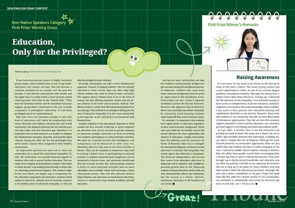 The contest’s essay prompt read: “The Bank of Korea recently released a report indicating that a student’s background, particularly their parents’ financial status, significantly affects their chances of being admitted to prestigious universities. This economic disparity leads to increased spending on private education, creating unequal educational opportunities. In a context where socioeconomic background often overshadows a student’s potential, what effective measures can universities implement to promote a fairer educational system? Use specific reasons and examples to support your viewpoint.”