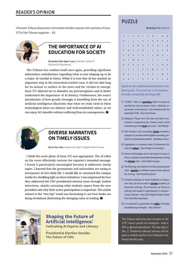 I think the cover photo of Issue 375 was appropriate. The artificial intelligence robot on the cover effectively conveys the reporter's intended message. I found it particularly meaningful because it addresses timely topics. I learned that the government and universities are trying to incorporate AI into daily life. I would like to commend the campus media for shedding light on these initiatives. Additionally, I was impressed by how they addressed the CNU presidential election issue through student interviews, clearly conveying what students expect from the new president and why their active participation is important. The article related to the “text hip” trend was also striking. It was fascinating to see how books are being revitalized, illustrating the changing value of reading. I cannot wait for future stories from the Tribune.
