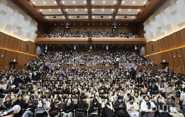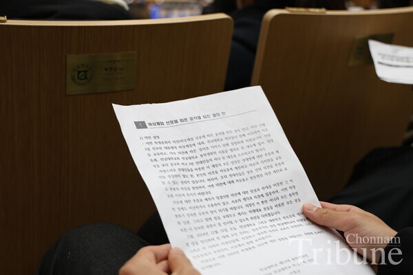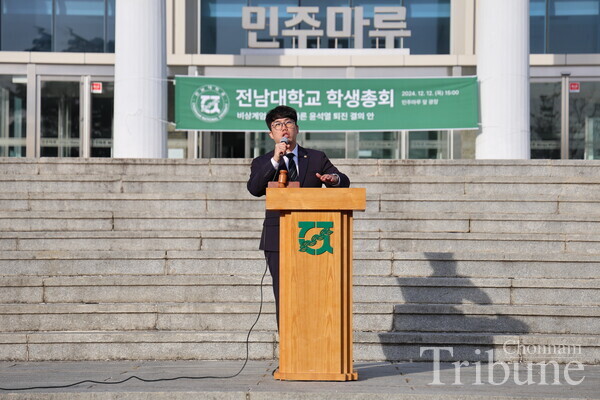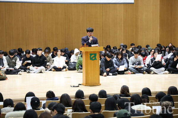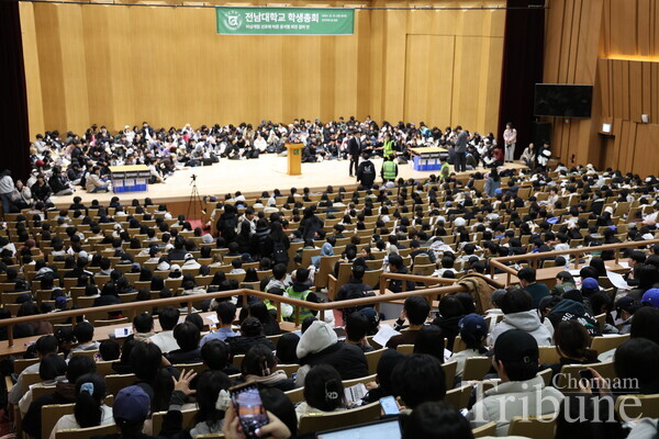 The General Student Council (GSC) held a student assembly at Minjumaru on Dec. 12 to discuss the resolution for the resignation of President Yoon Suk-yeol following his declaration of martial law. According to Chonnam National University's student council rules, it is possible to hold the event if more than 1,426 students attend, one-tenth of the total number of students. The voting began by filling the quorum in about four and a half hours. Yoon's resignation resolution was approved with 1,467 votes, five against it, and 28 abstentions out of 1,500 total votes cast.