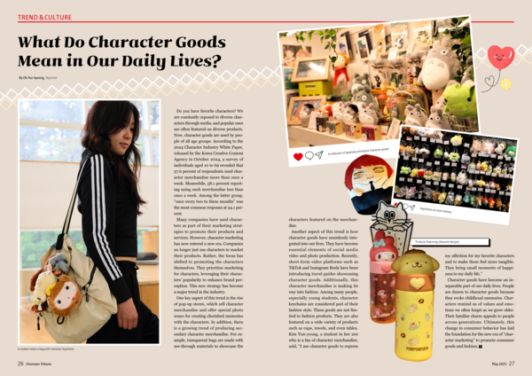 Another aspect of this trend is how character goods have seamlessly integrated into our lives. They have become essential elements of social media video and photo production. Recently, short-form video platforms such as TikTok and Instagram Reels have been introducing travel guides showcasing character goods. Additionally, this character merchandise is making its way into fashion. Among many people, especially young students, character keychains are considered part of their fashion style. These goods are not limited to fashion products. They are also featured on a wide variety of products such as cups, towels, and even tables. Kim Yun-yeong, a student in her 20s who is a fan of character merchandise, said, “I use character goods to express my affection for my favorite characters and to make them feel more tangible. They bring small moments of happiness to my daily life.”