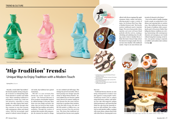 Recently, a trend called “hip tradition” has become popular among young people. It focuses on reinterpreting traditional elements in modern and stylish ways. When something traditional is presented in a trendy way, it feels new and attractive, especially to young people, who often express their tastes, identities, and beliefs through what they consume in ways that resonate with contemporary culture and shared values. With the increasingly rapid spread of cultural content through social media, hip traditions have gained momentum.