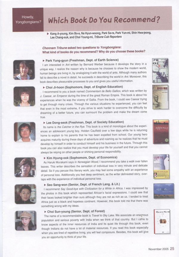 Tribune Cub-Reporter tribune1968@cnumedia.com 저작권자 © Chonnam Tribune 무단전재 및 재배포 금지 개의 댓글 작성자 비밀번호 댓글 내용입력 댓글 정렬 최신순 추천순 답글순 BEST댓글 BEST 댓글 답글과 추천수를 합산하여 자동으로 노출됩니다. 닫기 더보기 댓글삭제 삭제한 댓글은 다시 복구할 수 없습니다. 그래도 삭제하시겠습니까? 비밀번호 닫기 댓글수정 댓글 수정은 작성 후 1분내에만 가능합니다. 본문 / 400 비밀번호 닫기 내 댓글 모음 닫기 IMPORTANT NEWS Behind the Dots: Bridging Education Through Tactile Writing System The Changing Dynamics of Power Distance Across the World What Do Character Goods Mean in Our Daily Lives? Artistic Engagement Empowers Students: Fostering Creativity Through Education and Club Activities Uncovering the Secrets of the Mind Through the Brain: Psychologist Kim Mun-soo Gwangju Wildlife Medical Center: Fulfilling Its Mission to Protect Wild Animals