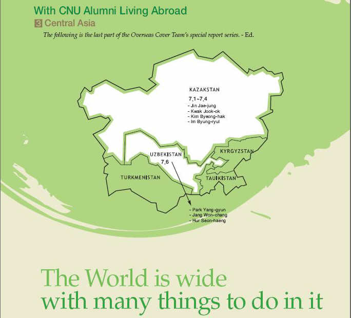 The following is the last part of the Overseas Cover Team (OCT)’s special report series. In this issue, the Overseas Cover Third Team (OCTT) deals with CNU alumni living in Central Asia. The team members departed Korea for Kazakhstan on June 30, 2006, looking forward to seeing new CNU alumni. Let’s meet them. - Ed.
