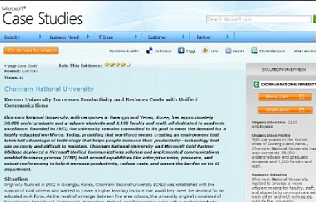 Chonnam National University (CNU) draws worldwide attention when its Unified Communications (UC) system was posted on the website of Microsoft’s Case Studies on June 9th. The Case Studies is well-known throughout the world as positive references for Microsoft to inform world-wide advanced IT trend and share its customers’ technological success stories, showing how organizations use technology to solve their problems on its web site. CNU has tried to establish an efficient communication system which is necessary for faculty, staff and students since 2006, it merged with Yeosu University. In 2009, it deployed a Microsoft Unified Communications solution that includes enterprise voice and integration with various existing communication tools such as Voice over IP, FAX, E-mail, Smartphone, Messenger and video conference With the UC system CNU can increase productivity, reduce costs and lessen the burden on its IT department to provide an efficient IT service. CNU has a plan to finish U-campus construction by 2015.